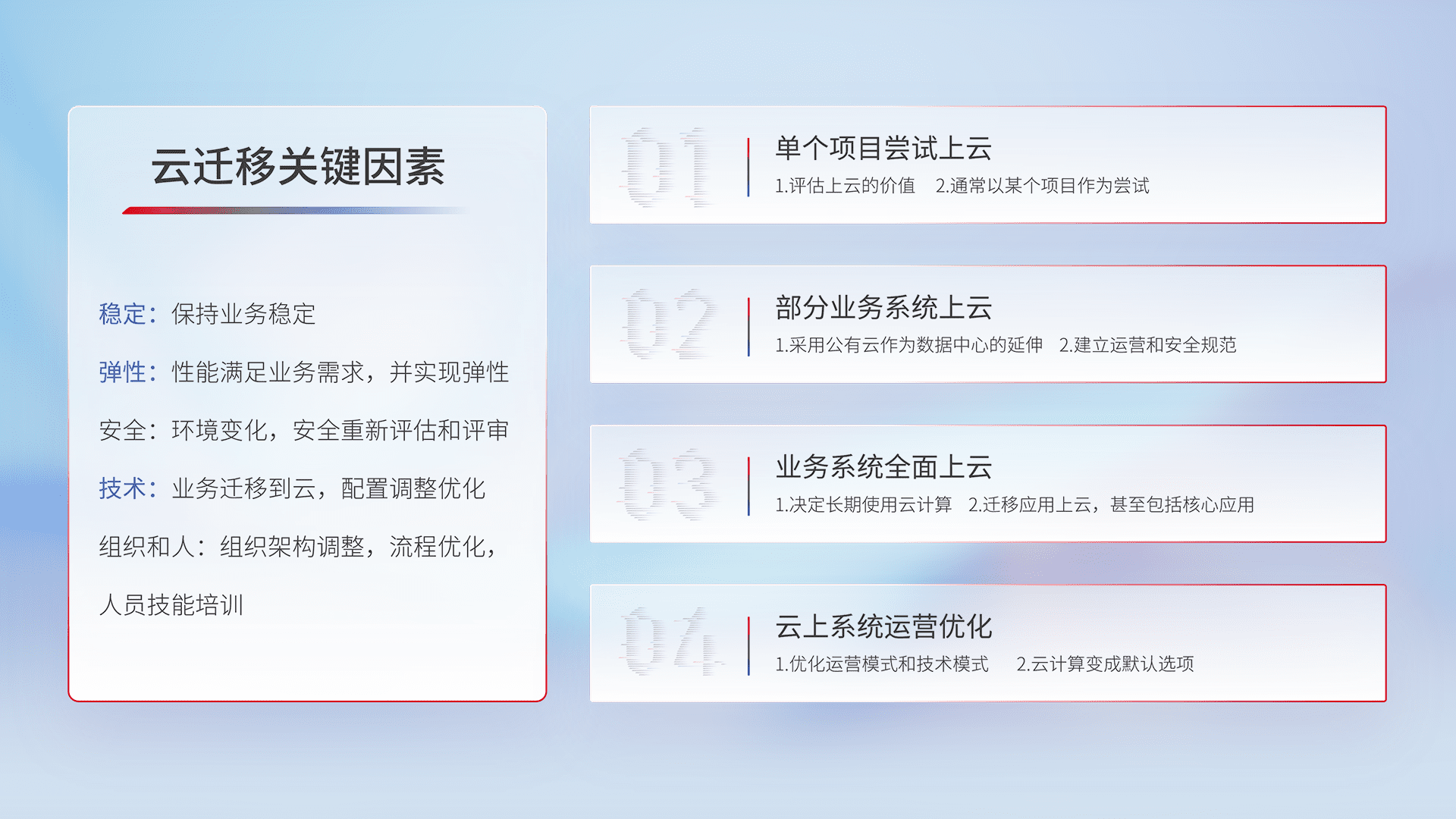 结合实际业务,,,从规划设计、、云平台选型、、、云原生改造、、、、数据迁移、、、集成交付,,,,迁移全过程为客户识别最佳上云路径,,做好风险识别管理,,设计网络架构、、、身份权限、、安全审计合规、、、操作审计、、日志审计、、、监控告警策略、、、、多站点容灾设计等,,,对云上基础设施进行整体规划,,,提升IT治理水平,,以满足弹性、、、高可用、、高性能的需求。。。。